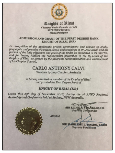 • Due to all the services rendered and contributions throughout Asia, Carlo was recommended for a knighthood and then granted by KNIGHTS OF RIZAL on the 25.10.2018.